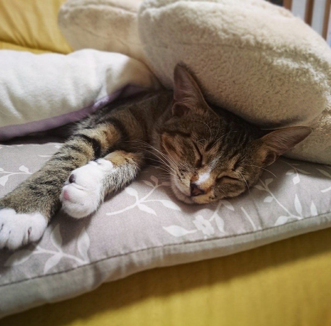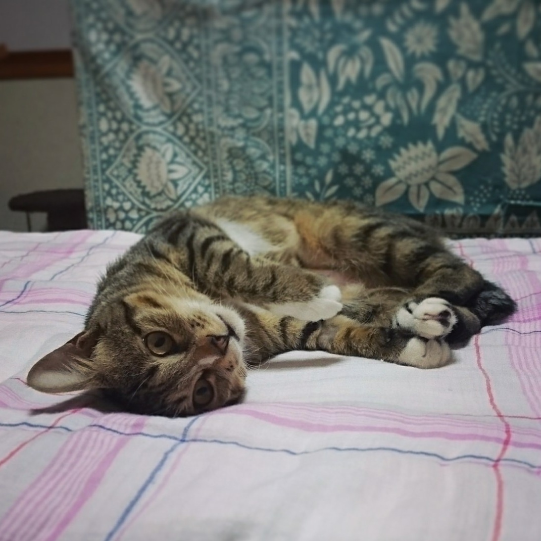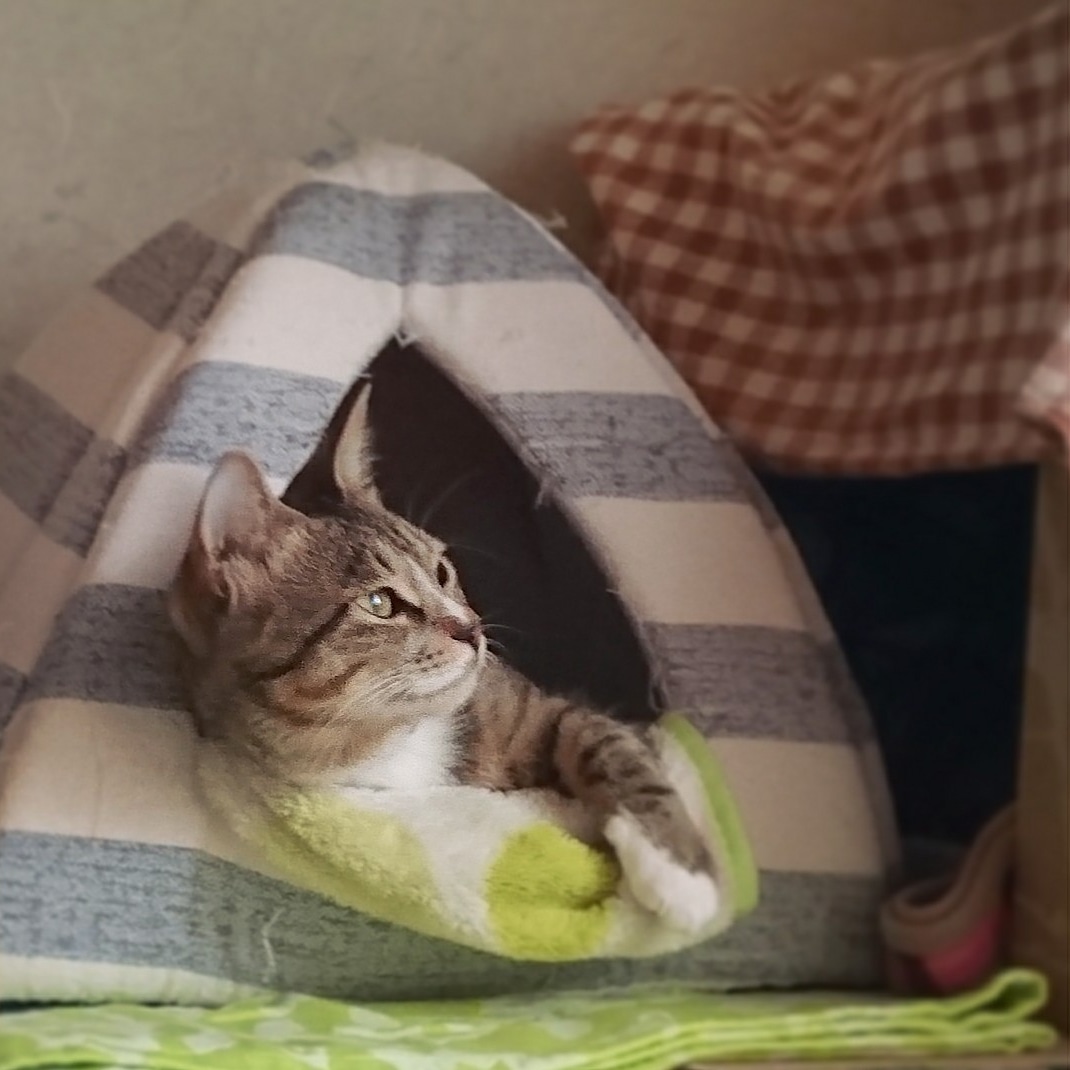 明け方からニャーニャー運動会をして、ゴハンを食べて、ぷりっと排泄して、きれいに掃除してもらって、おもちゃで遊んでもらって、あとは寝るだけとなったところ。