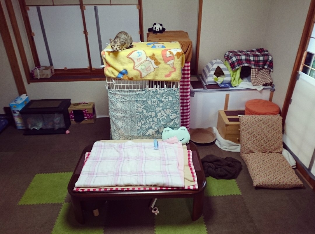 けど、暴れん坊がケージのてっぺんから床へびょーーーんとダイブするので、段差を少なくするためのモノがあれこれ増えた。