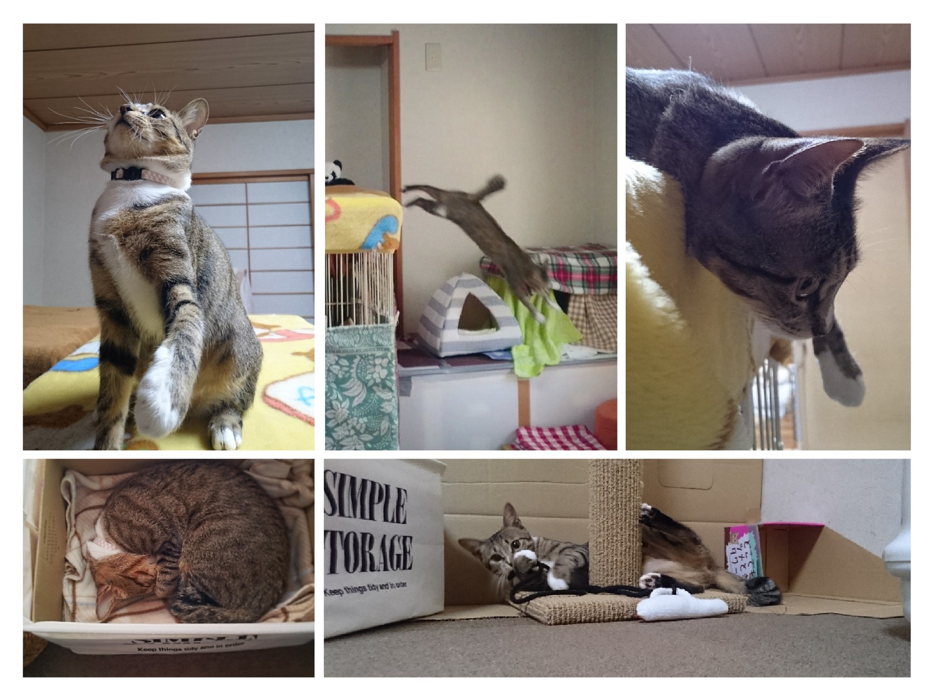 左上から時計回りに、下僕に猫パンチを食らわせようと狙っているところ、ケージからびょーーーんとジャンプしたところ、遊び疲れてデレーンとなっているところ、爪研ぎ台と自分におもちゃのヒモが絡まってるのにゴロゴロ喜んでるところ、窓際の箱で熟睡しているところ。