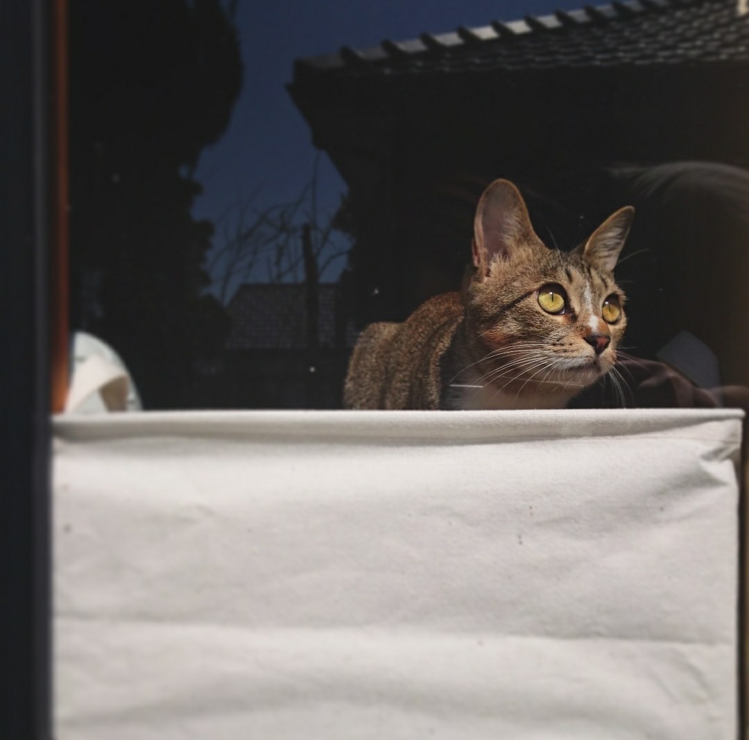 白いかごに出たり入ったり、縁に足をかけて伸びをしたり、時々ニャーと鳴いてみたり。