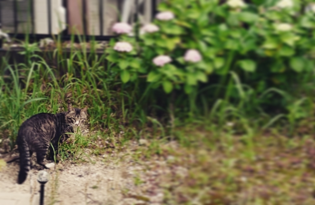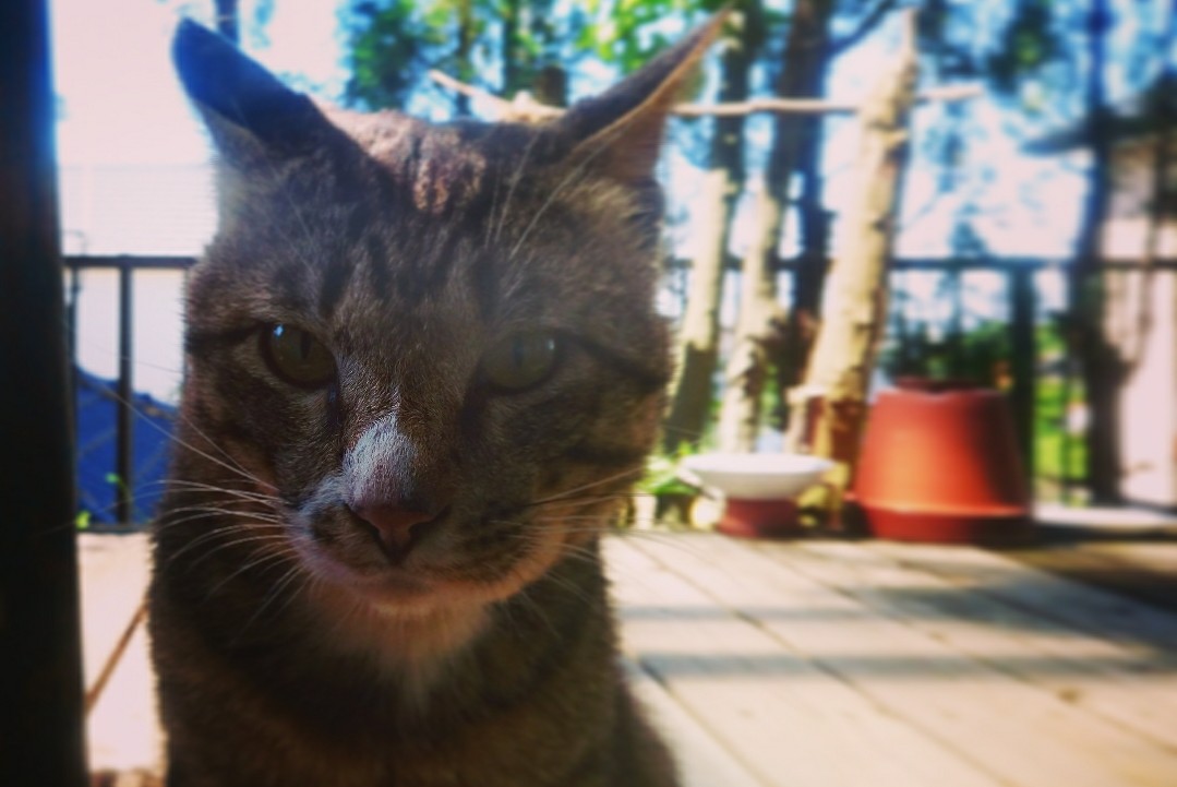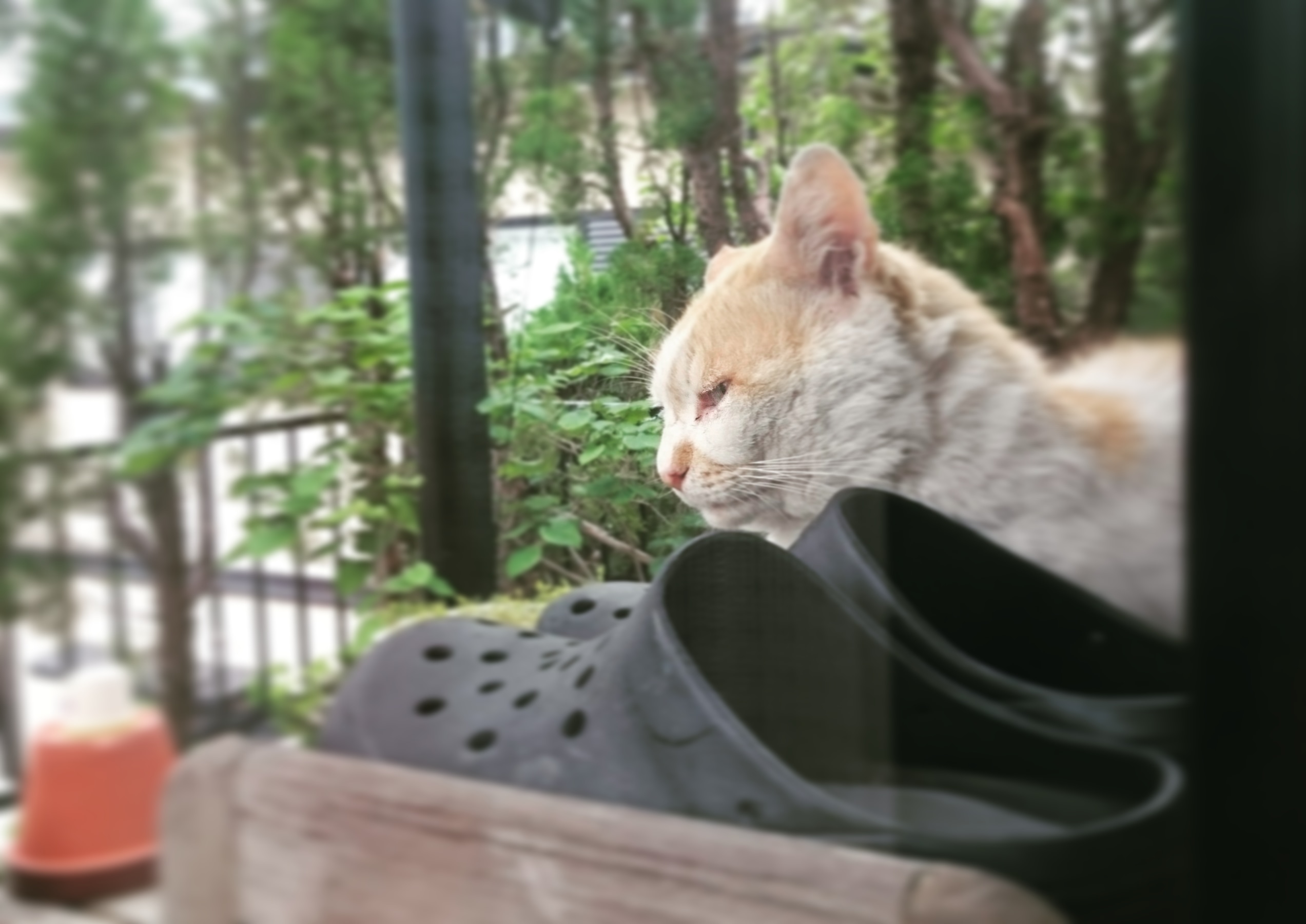 ボスが勝手口のところでくつろいでたけど、庭からだと距離があってボケちゃった。