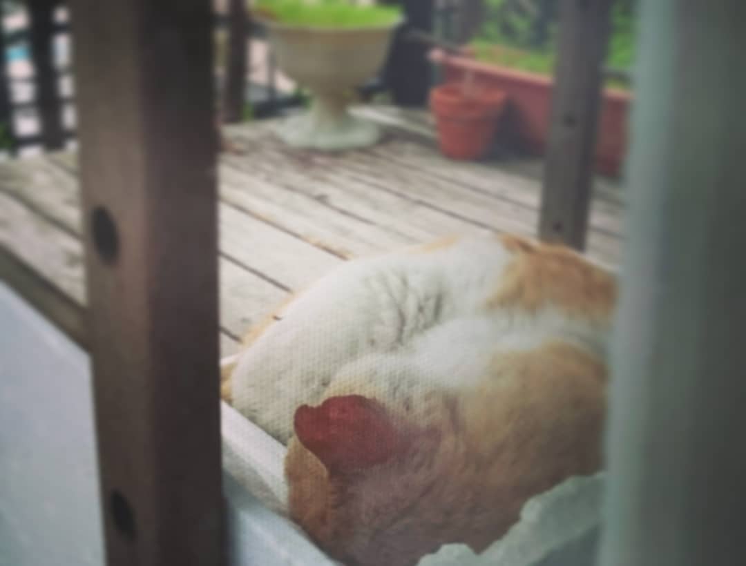 ガーデンラックに放置している発泡スチロールの箱に入って寝ているボス。