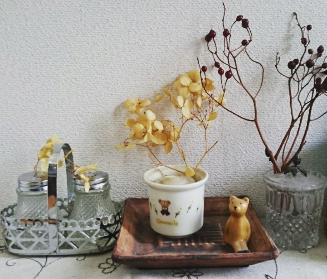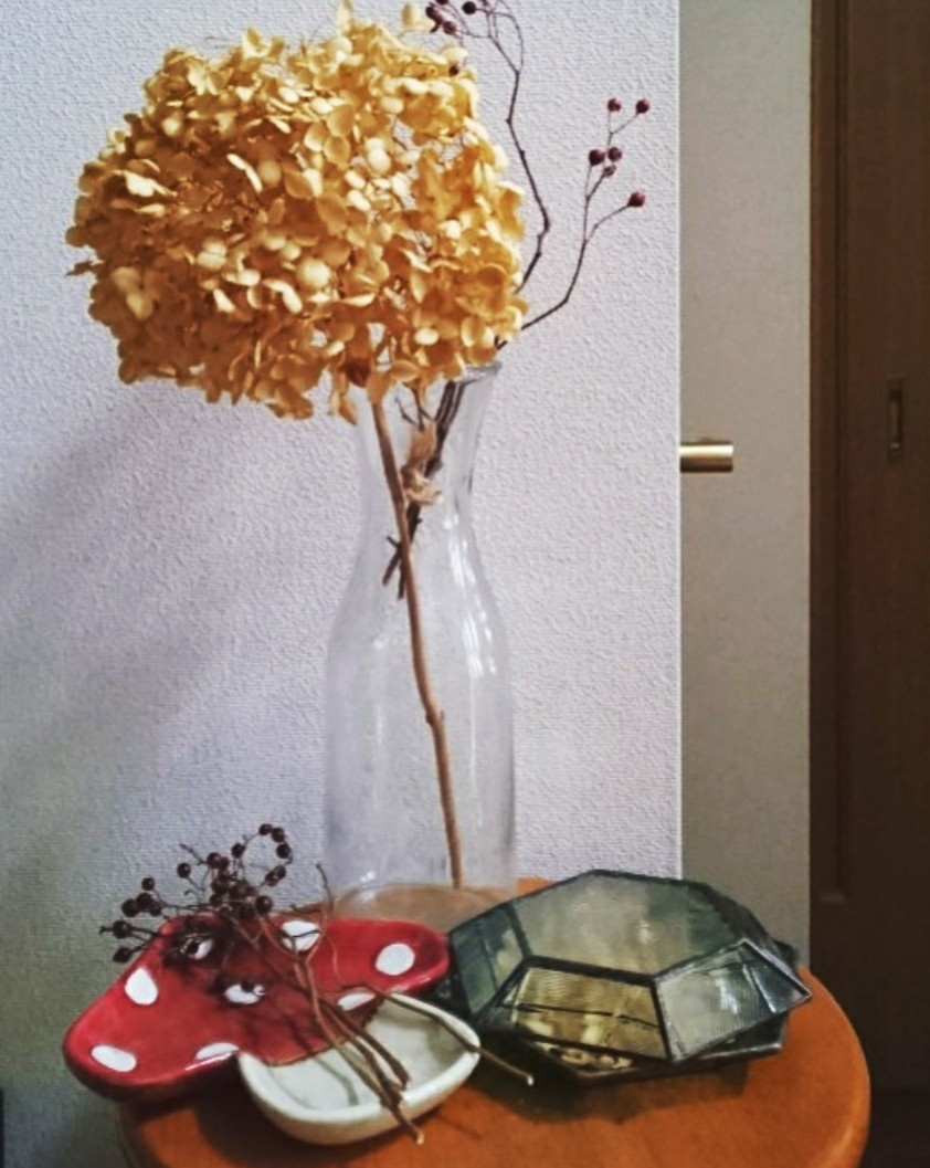 ドライフラワーは自宅にある雑貨と組み合わせて、しばらくは飾って楽しむことにする。
