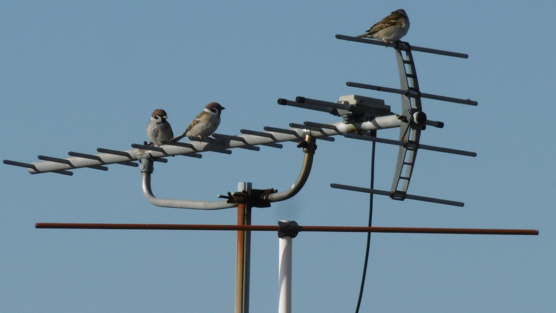 ウッドデッキで洗濯物を干していたら、斜め下のお宅のアンテナにスズメが。