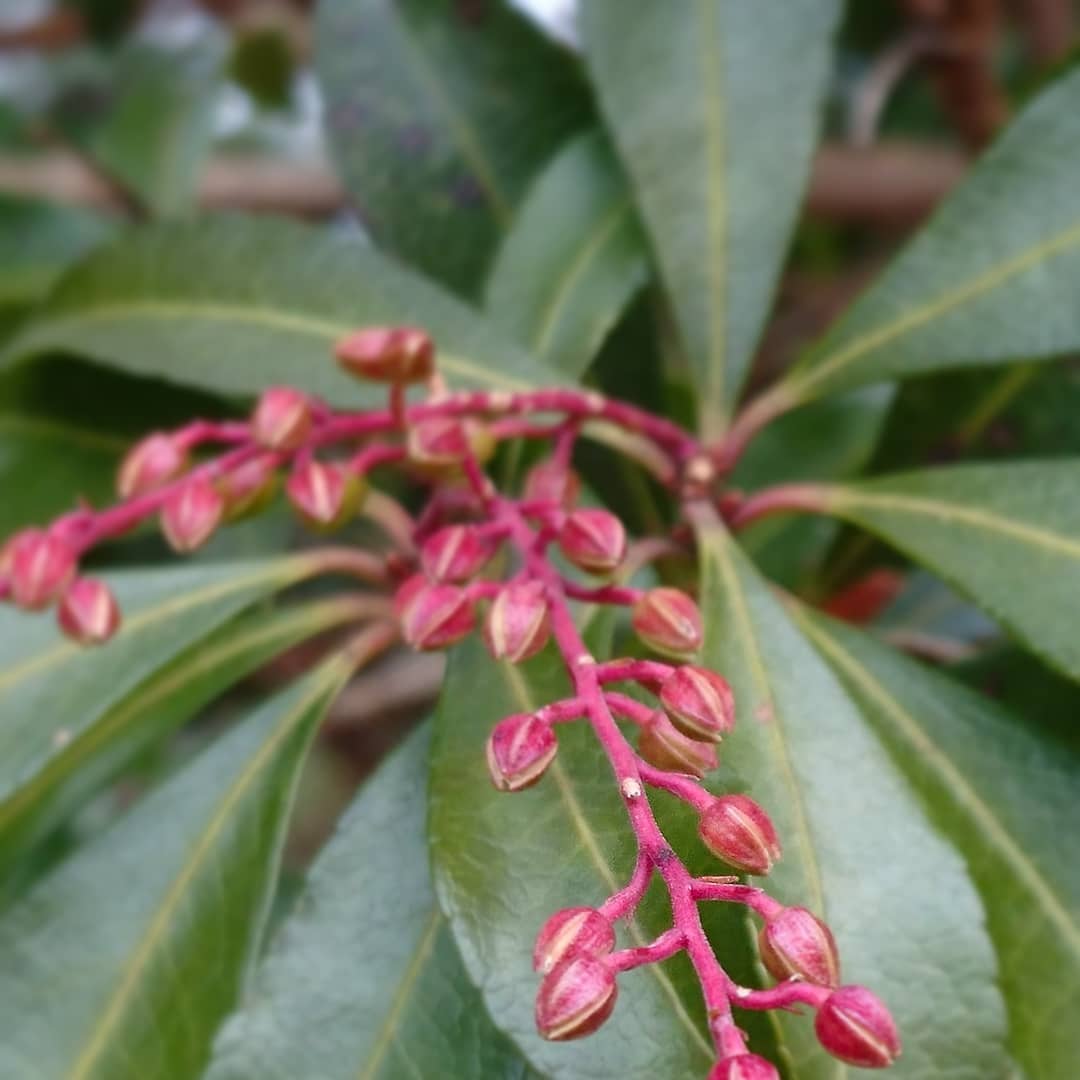 冬景色の中で馬酔木のつぼみのピンク色が鮮やか。