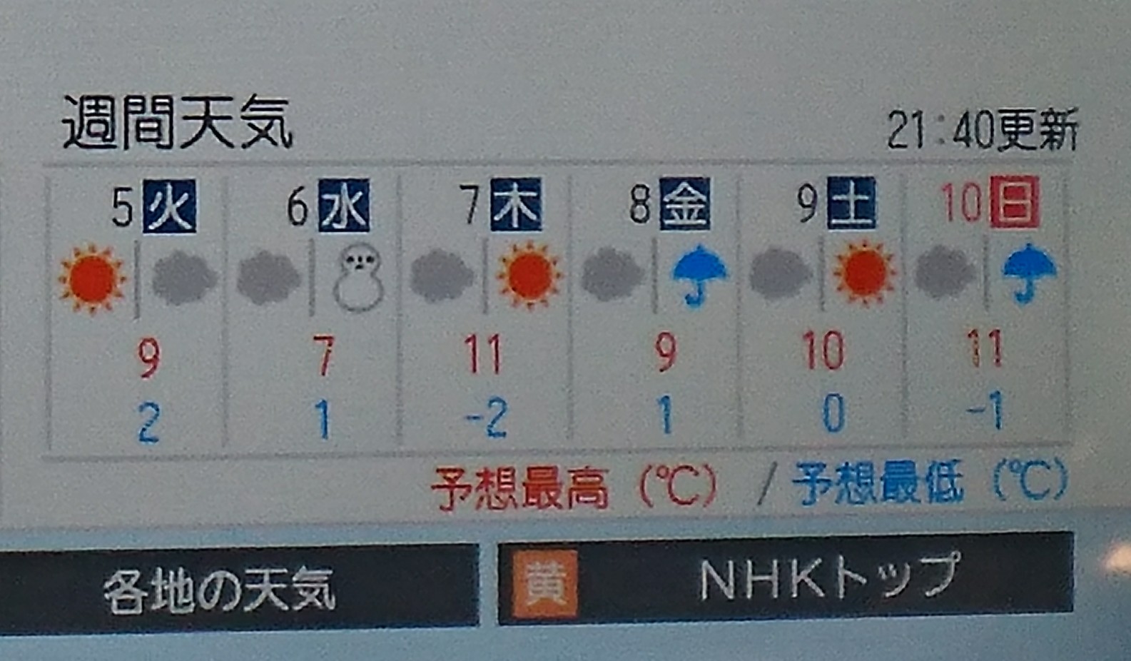 昨日の天気予報に雪だるまが出た。
