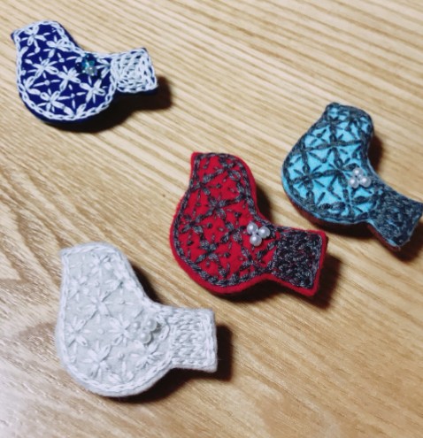 フェルトに刺繍を施したブローチ。