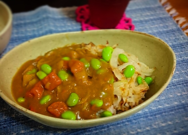 カレーに揚げた玉ねぎと枝豆をトッピング。