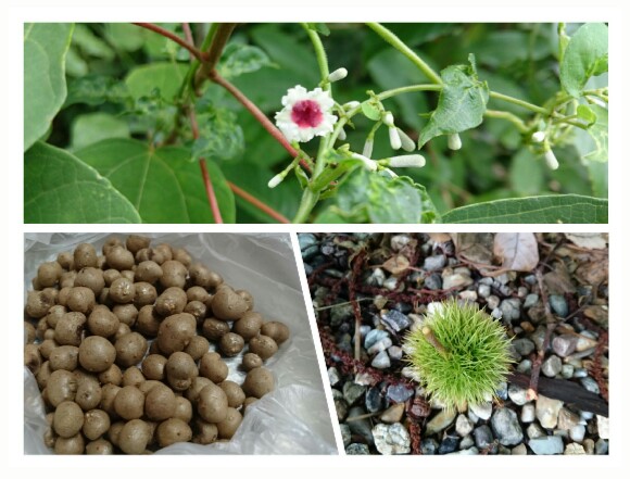 お墓でへくそかずらの花と栗をパチリ。