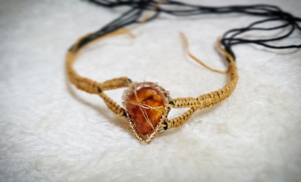 大粒の琥珀をワイヤーワークで固定して、マクラメ編みと合体させて。