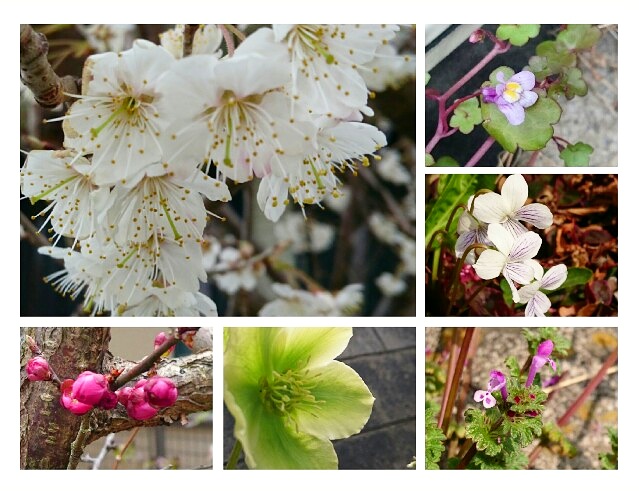 左上から、さくら、つたばうんらん、すみれ、ほとけのざ、クリスマスローズ、紅梅。