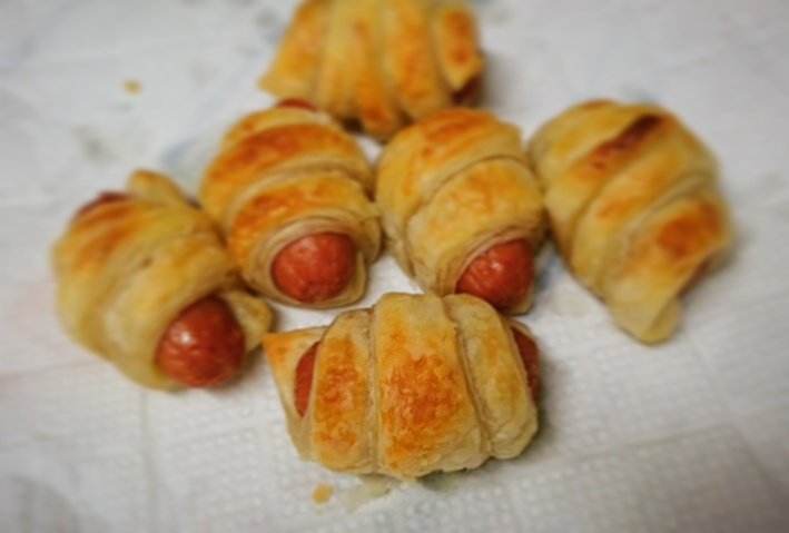 市販の冷凍パイシートを切って伸ばして、市販のミニウインナーにくるくる巻き付けて、オーブンで焼く。