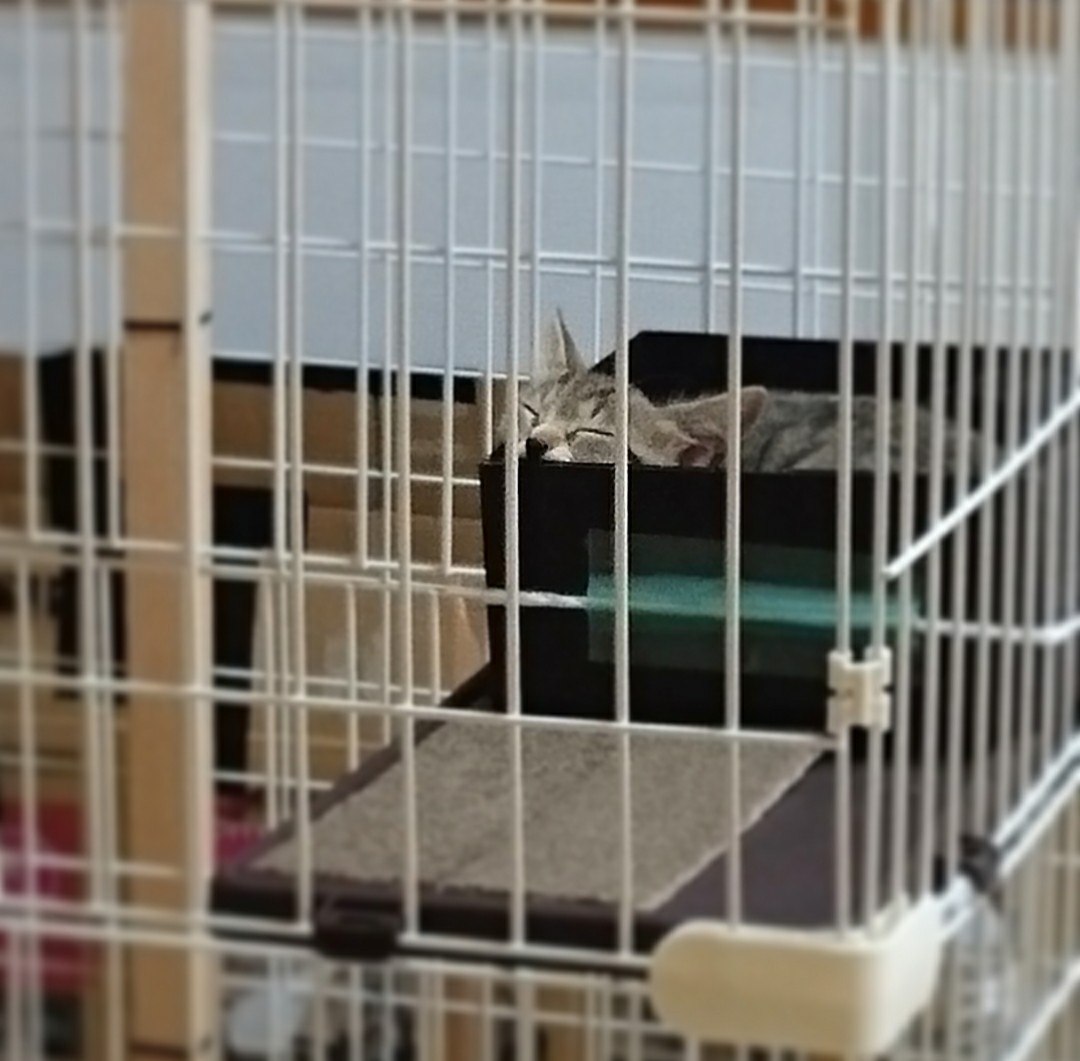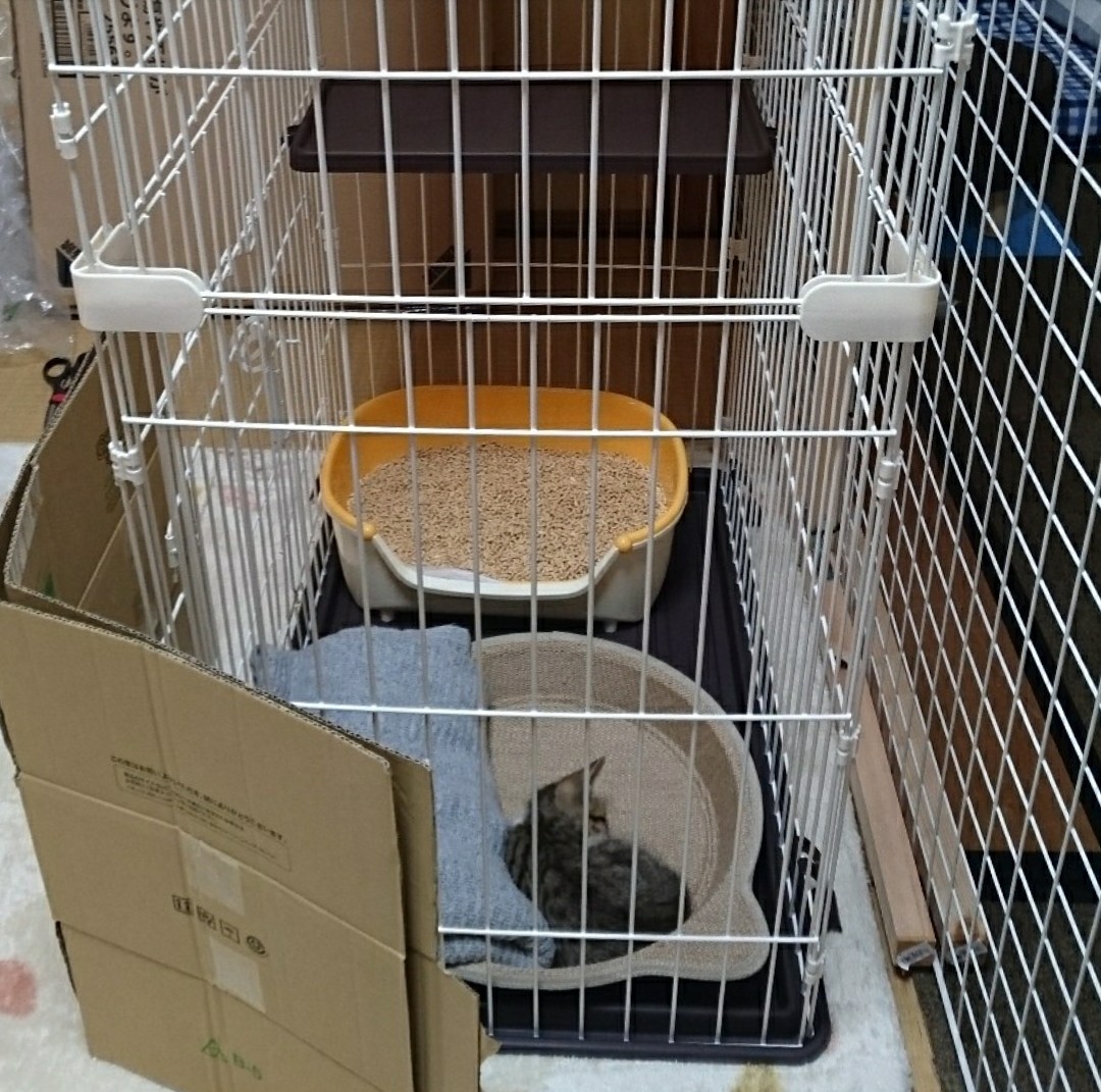 暴れん坊プリンセスは段ボールハウスに入れて、ネットと箱の隙間をなるべく少なくして、大急ぎで市販の猫ケージを買ってきた。