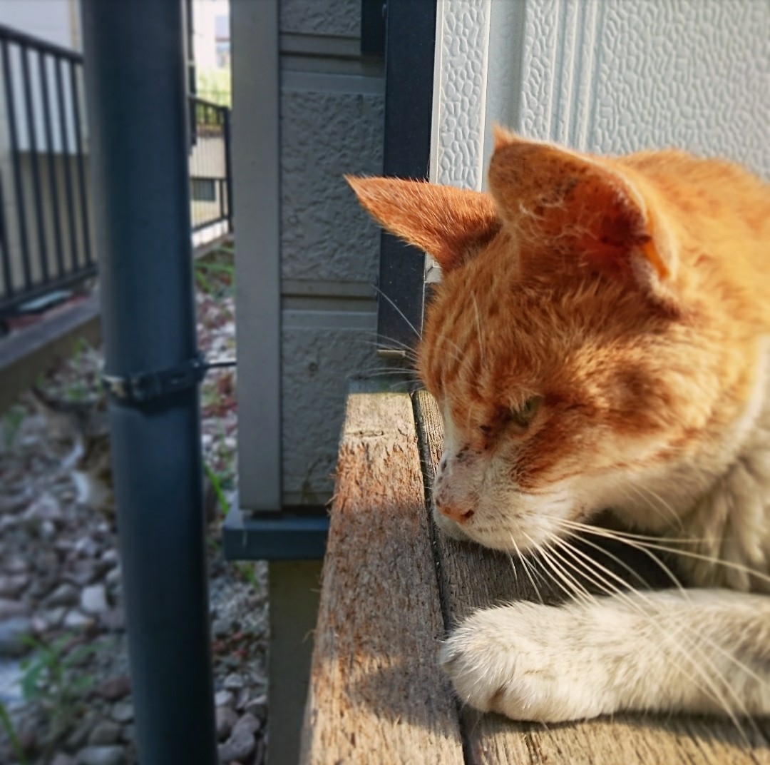 強風にあおられたバスマットがパタパタして鬱陶しそうだったので、段ボールを追加。