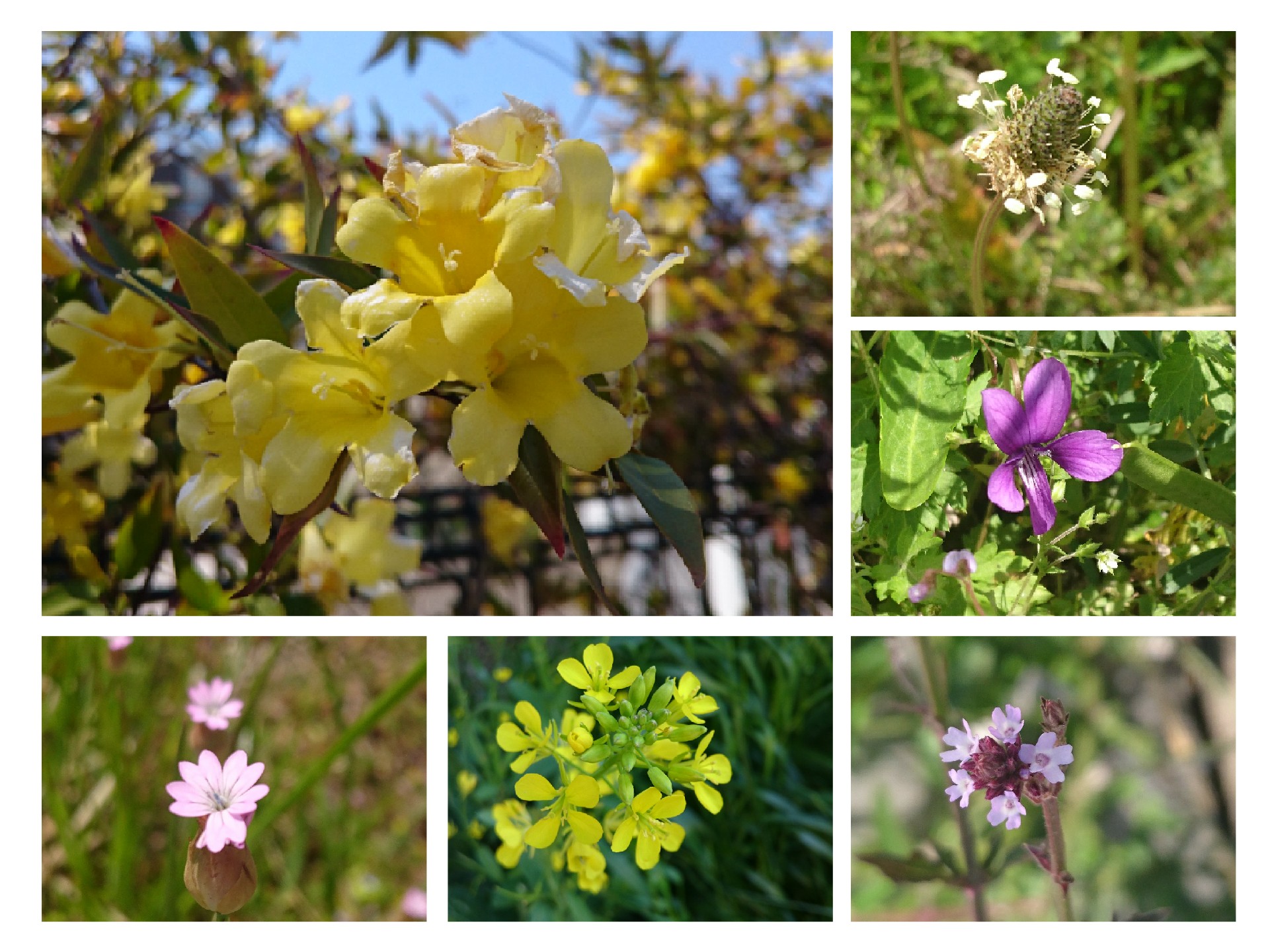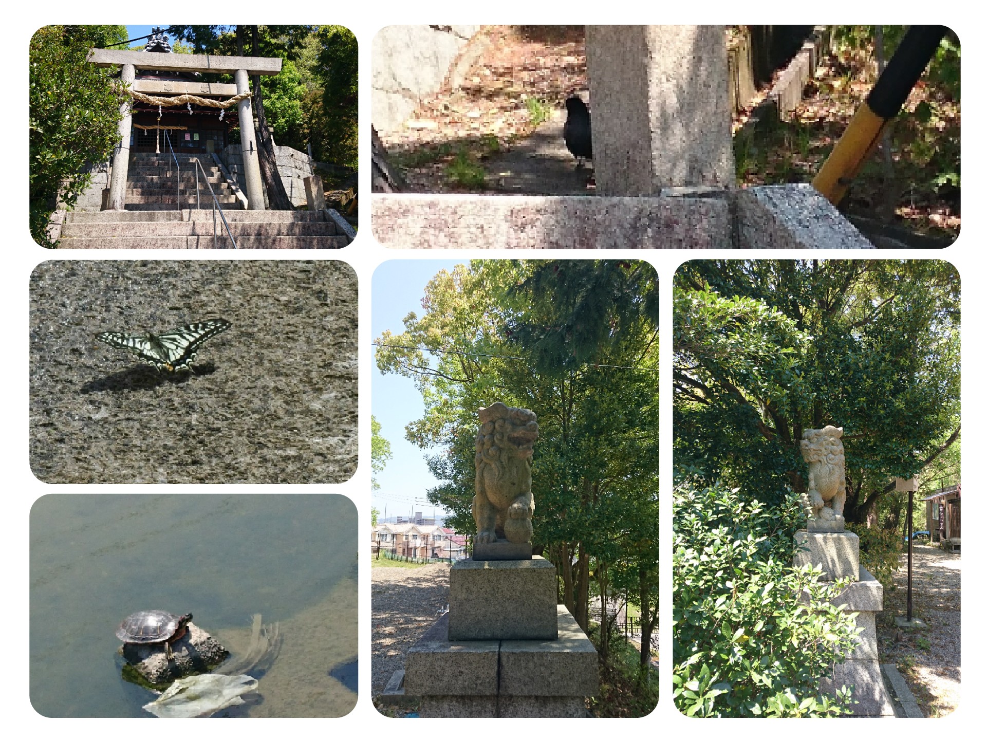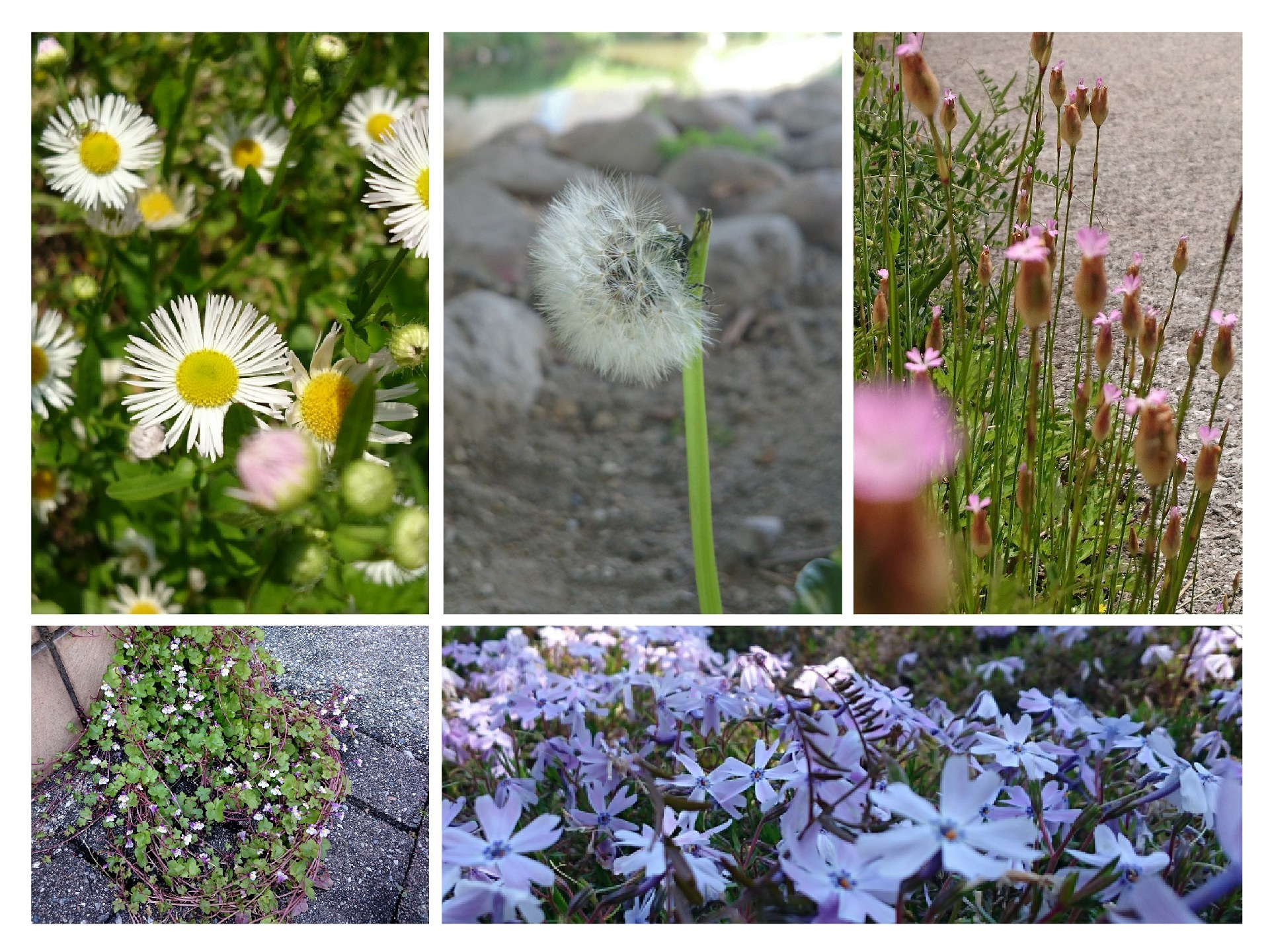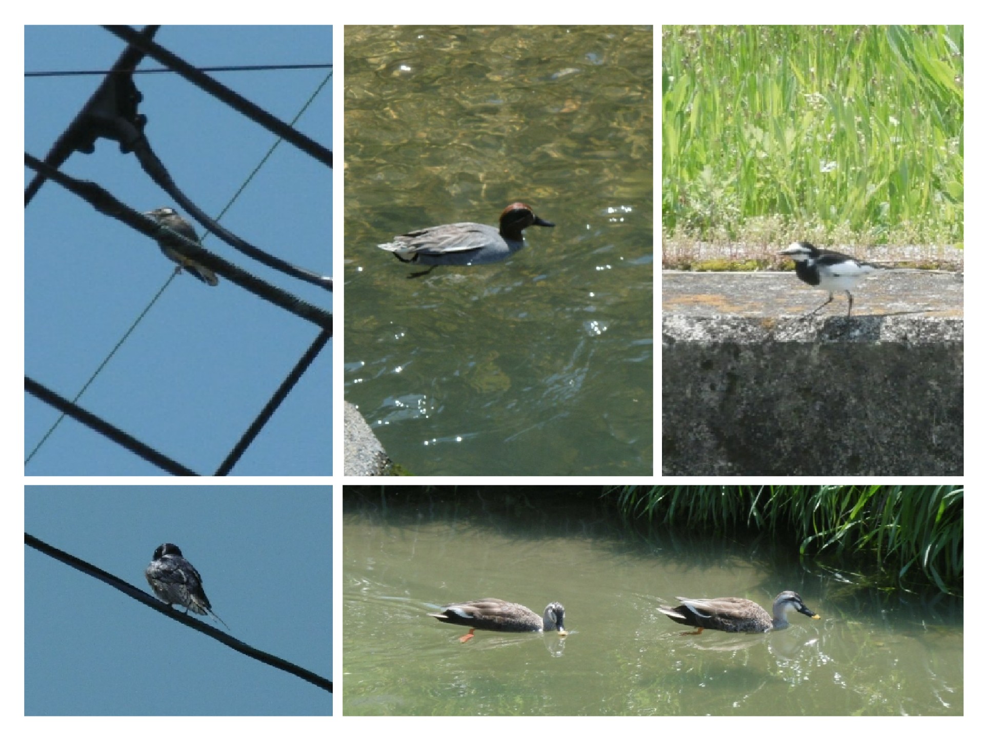 左上から時計回りに、ムクドリ、コガモ、セグロセキレイ、カルガモ、ツバメ。