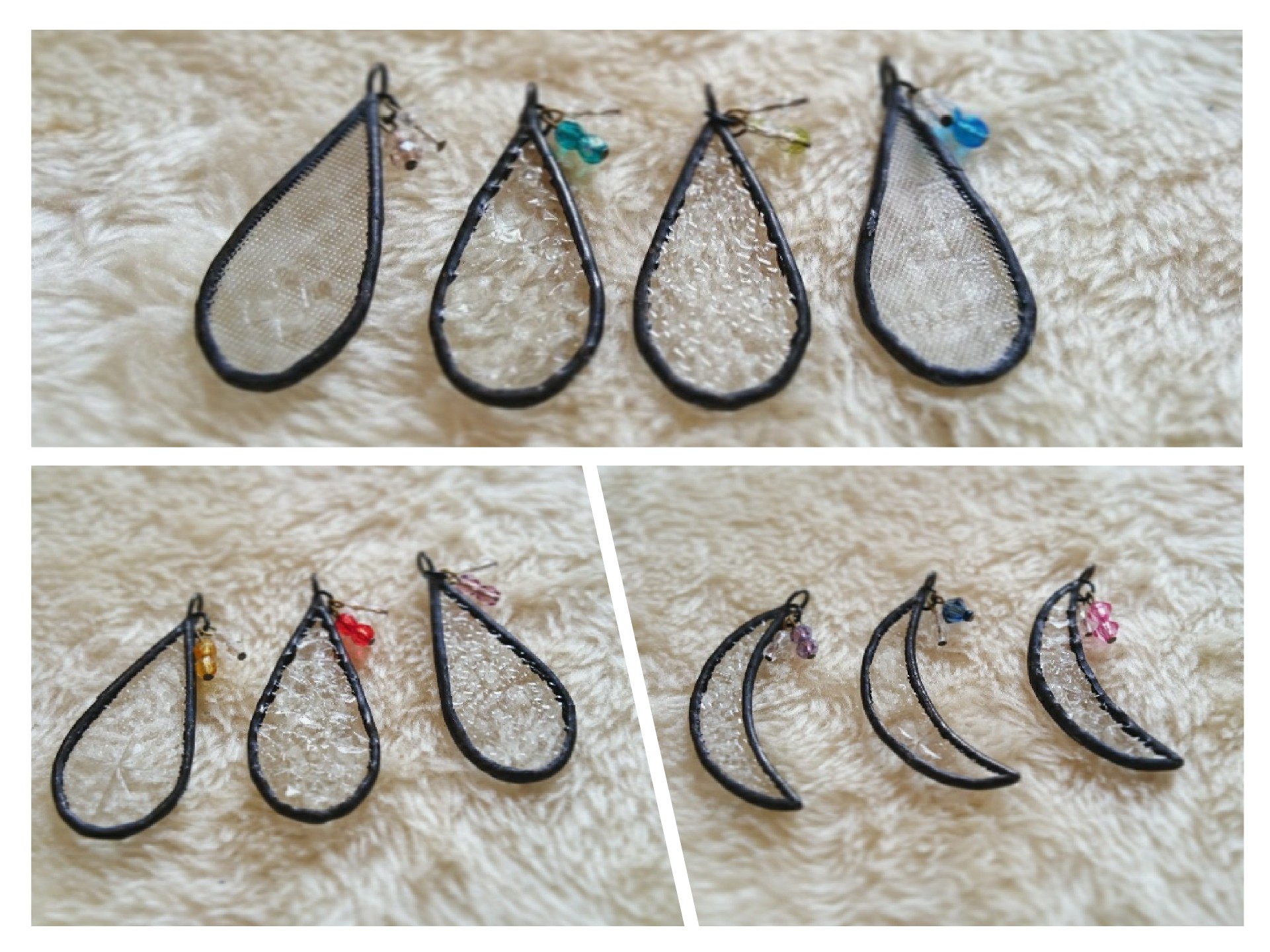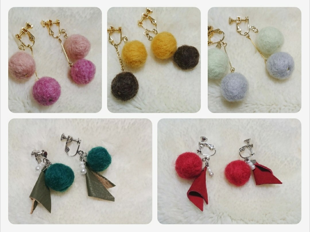 下段は羊毛フェルトボールに革の切れ端を組み合わせたイヤリング。