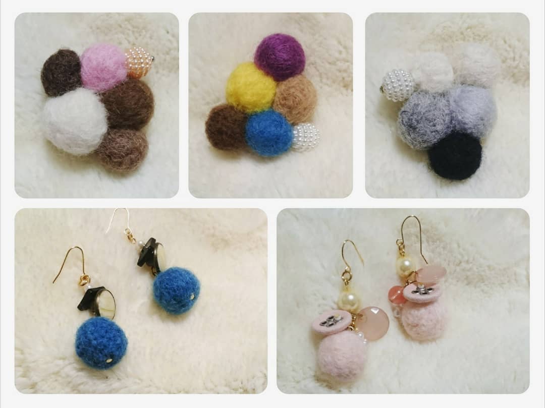 下段は羊毛フェルトボールとボタンとビーズを組み合わせたピアス。