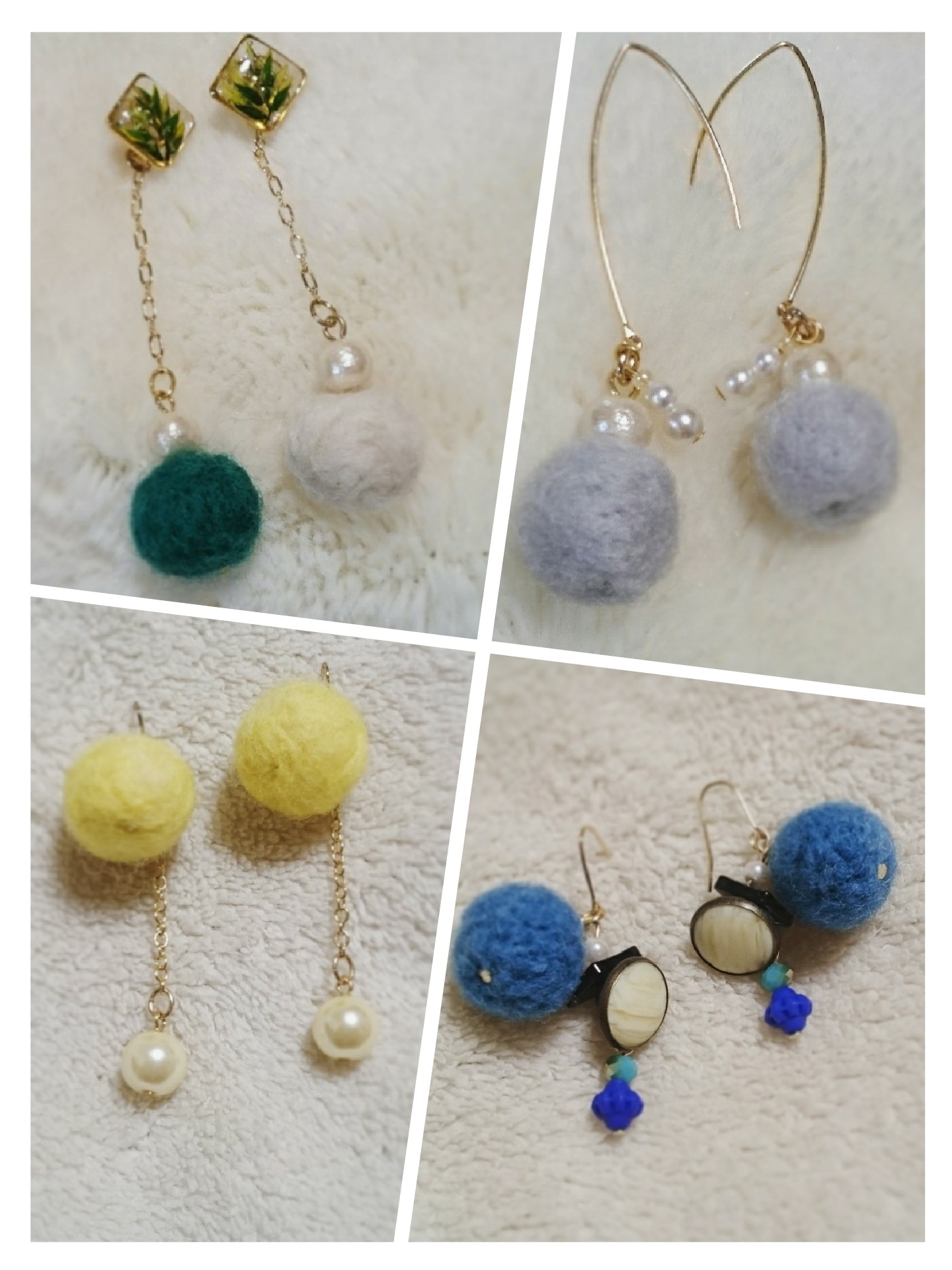 1枚目の上段は羊毛フェルトボールを長さちがいで2個つけたイヤリング。