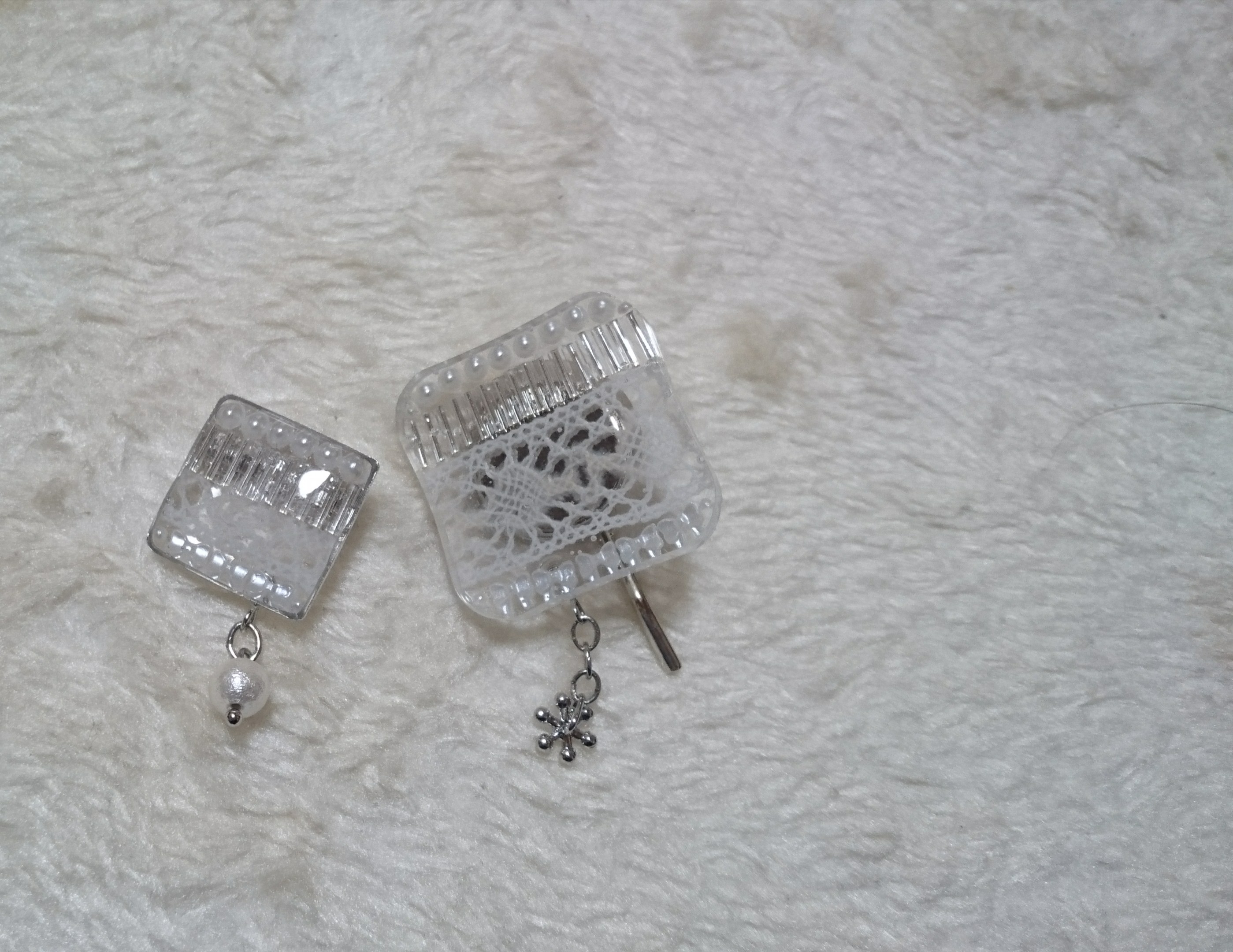 四角い形の中にパール、竹ビーズ、レース生地、パール調リボンモチーフをぎゅうぎゅうに詰めて。