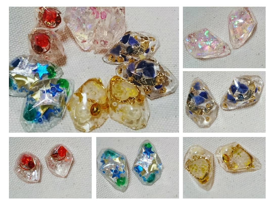 右上から時計回りに、オーロラ+ピンク、紺+ゴールド、イエロー+ゴールド、ブルー+グリーン+ゴールド+シルバー、オレンジ+レッド+ゴールド。