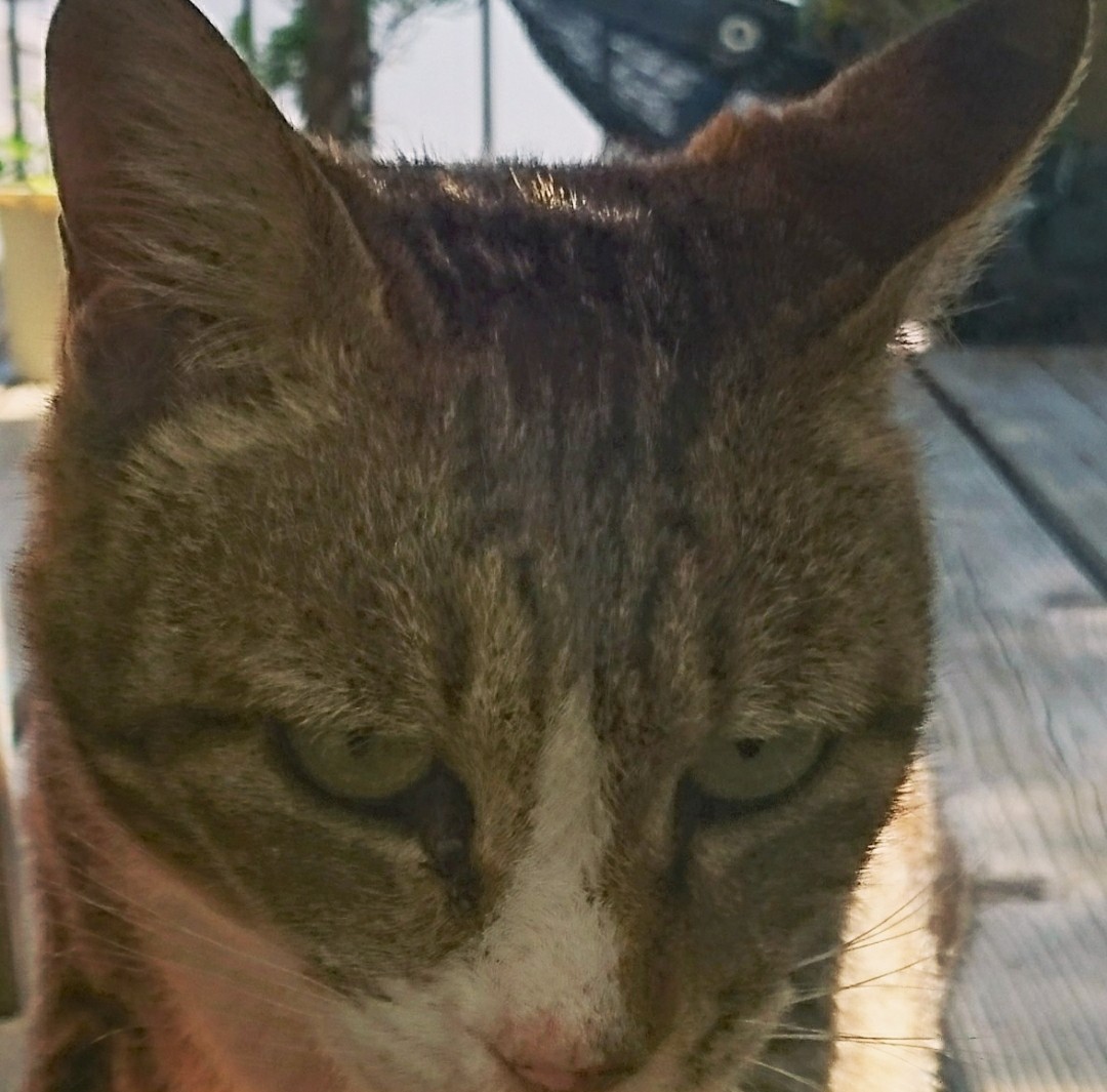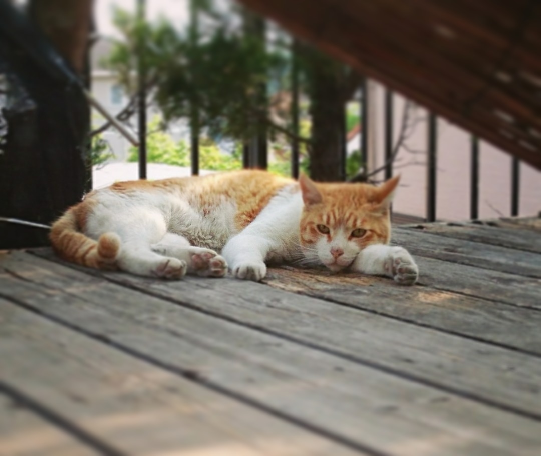 ら、ひょっこり現れウッドデッキでハナコと並んで「ニャー」と。