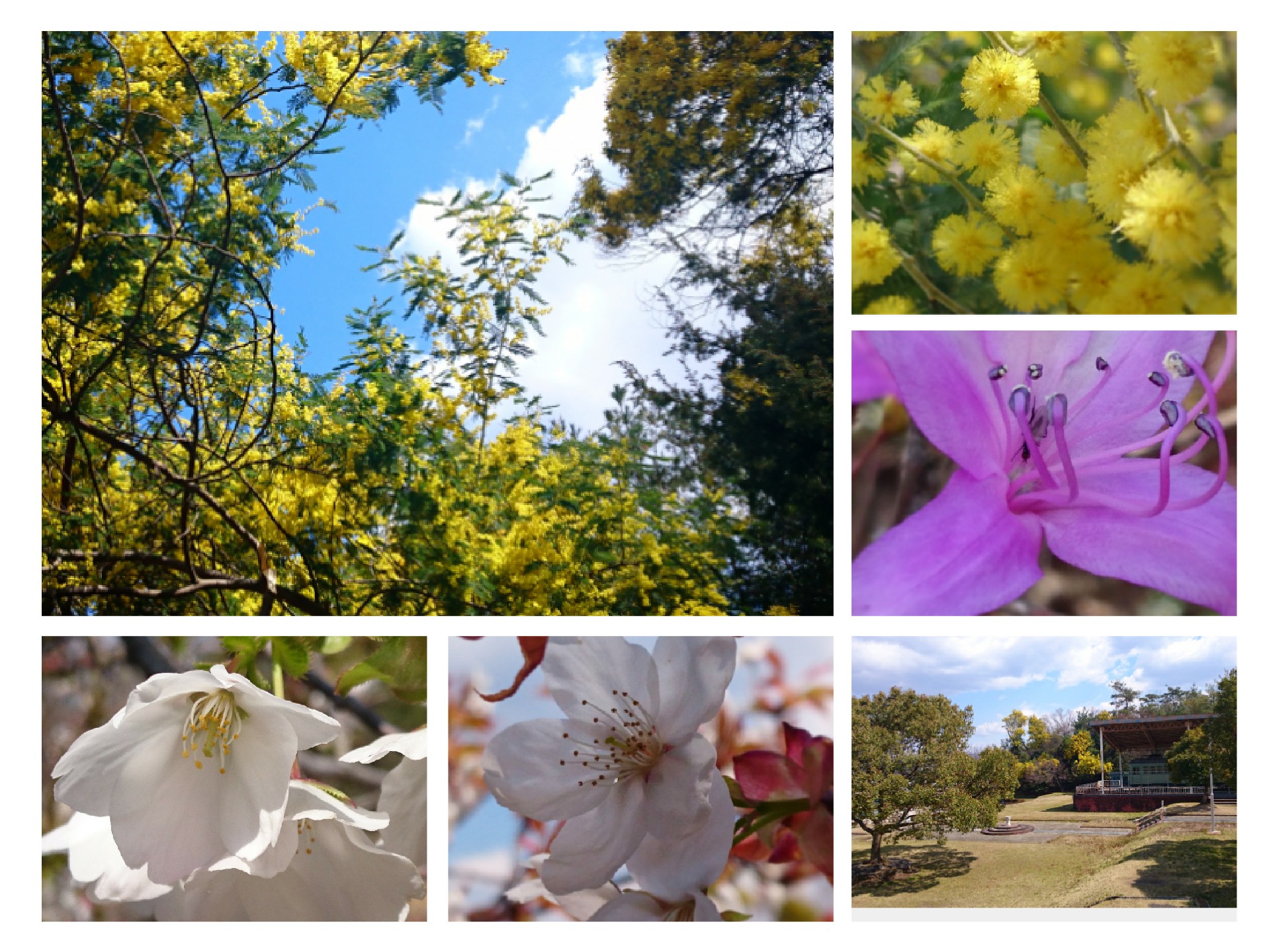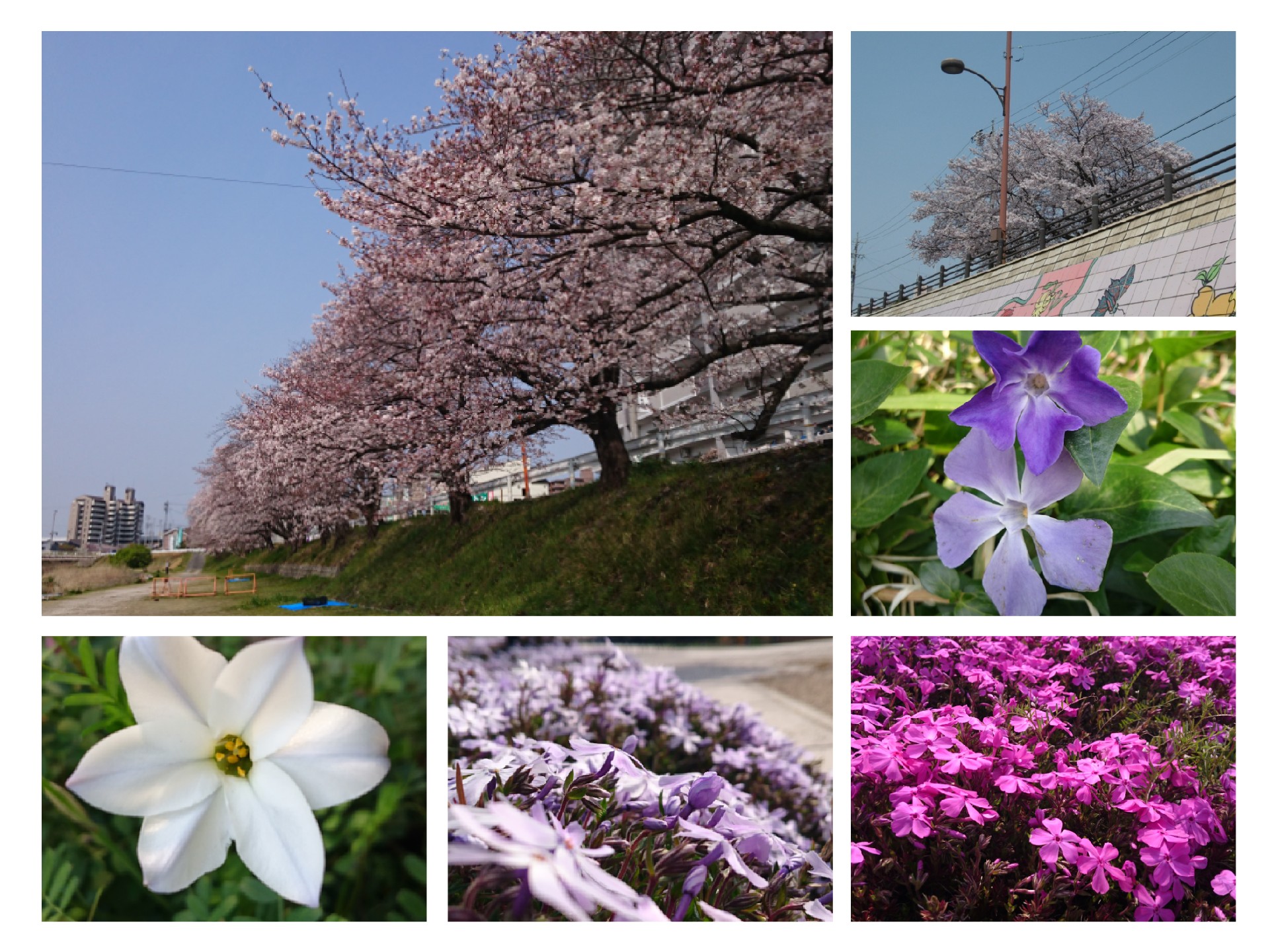 左上から時計回りに、桜、桜、ツルニチニチソウ、芝桜、芝桜、花にら。