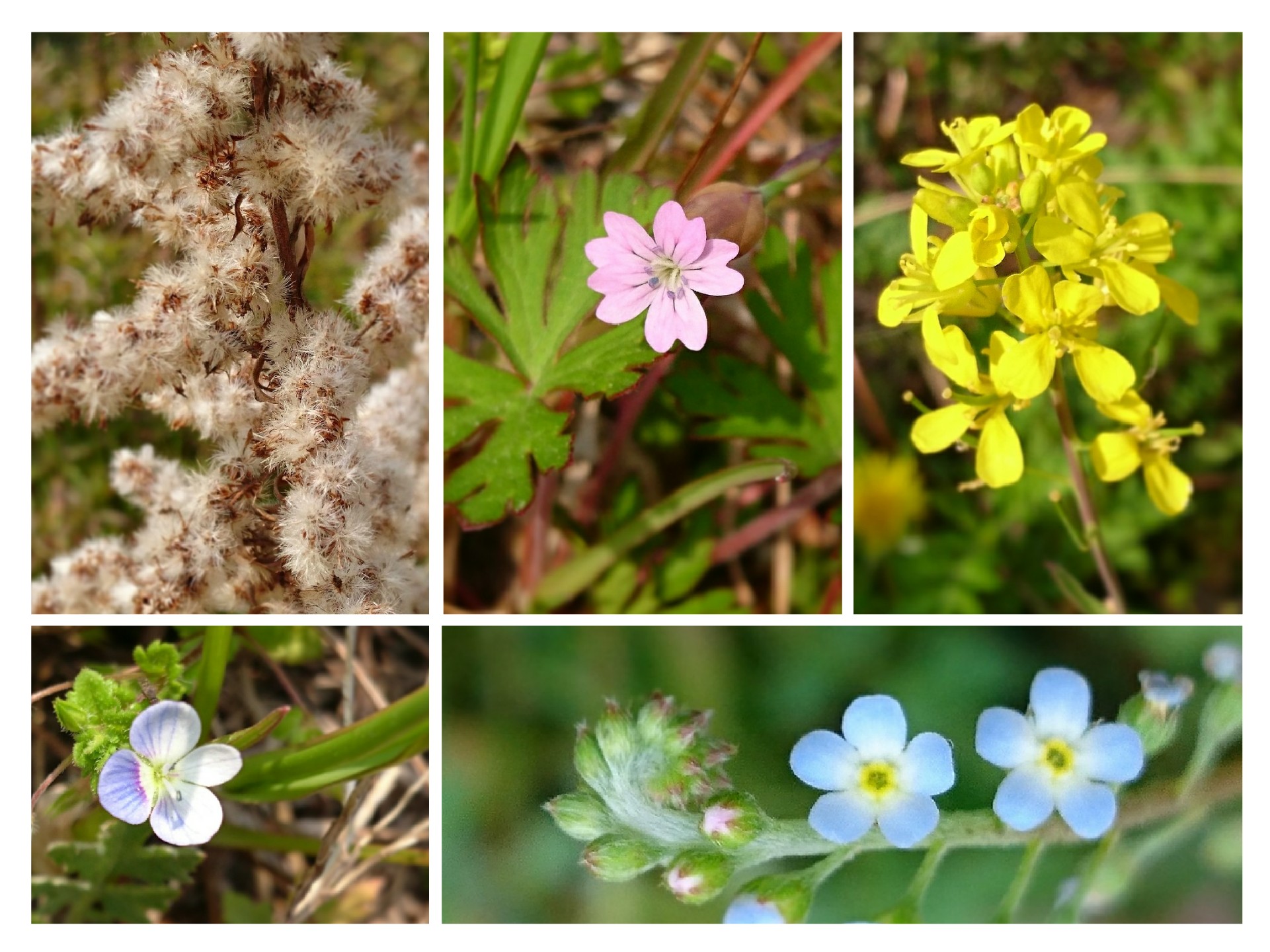 左上から時計回りに、セイタカアワダチソウの綿毛、アメリカ風露、菜の花、キュウリグサ、オオイヌノフグリ。