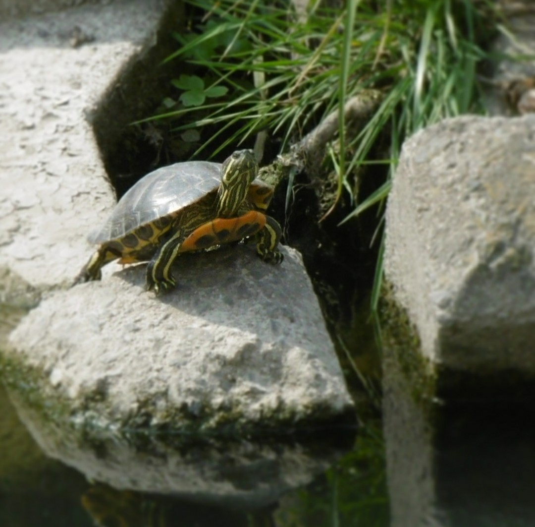 目の横んとこあんまり赤くないけどアカミミガメだろうなあ。