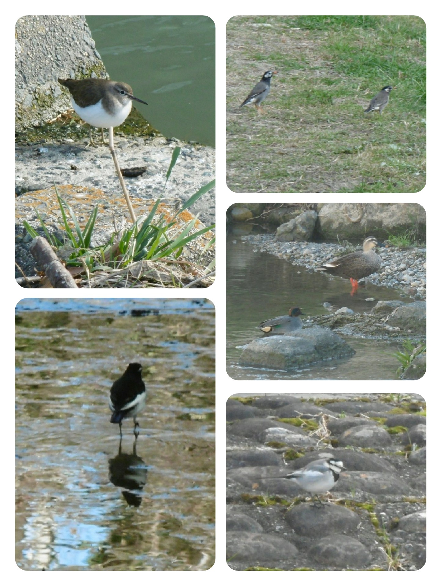 イソシギ、セグロセキレイ、ムクドリ、カルガモ、コガモ、ハクセキレイ。