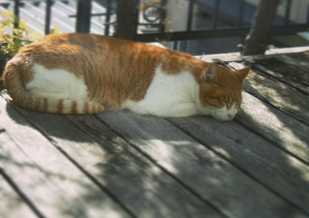 散歩から帰ってきたら、ウッドデッキでハナコが寝ていた。
