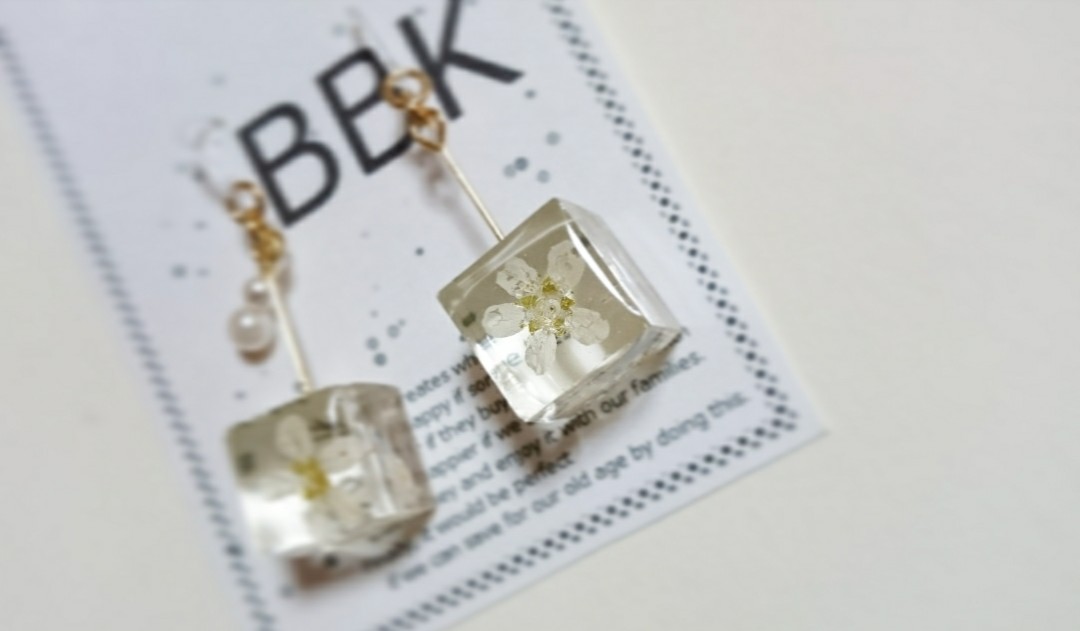 庭の雪柳(押し花にしてある)をレジンでキューブ型に固めたもの。