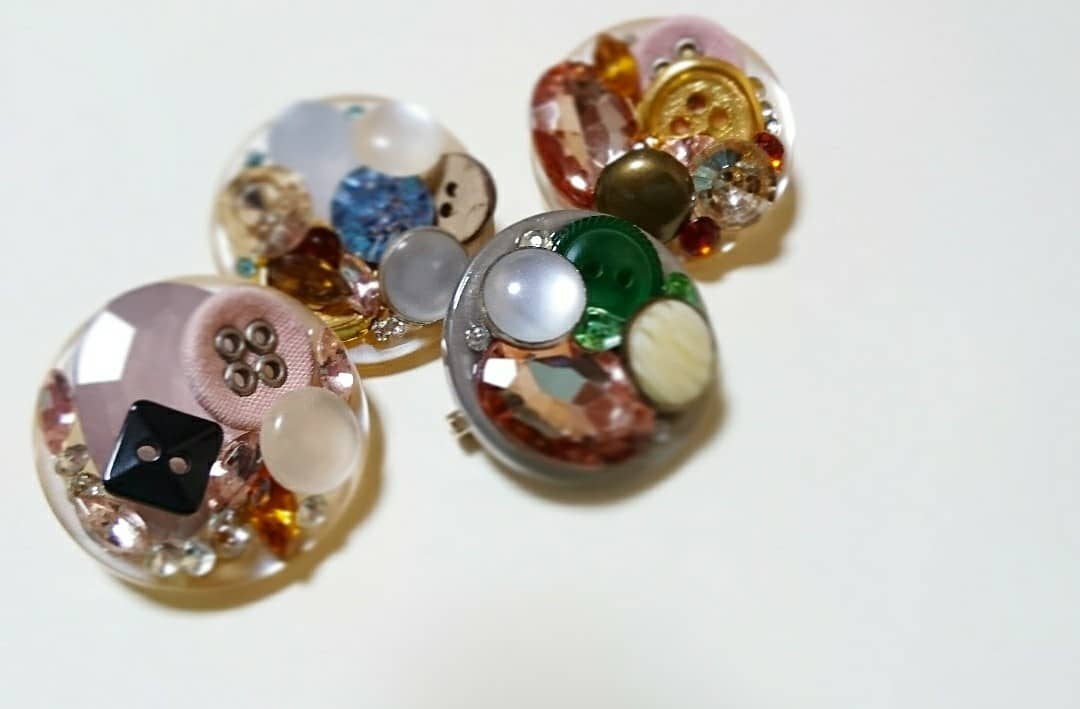 直径3㎝ほどの大きめボタンの上に、小さいボタンやキラキラのビジューをてんこ盛りに。