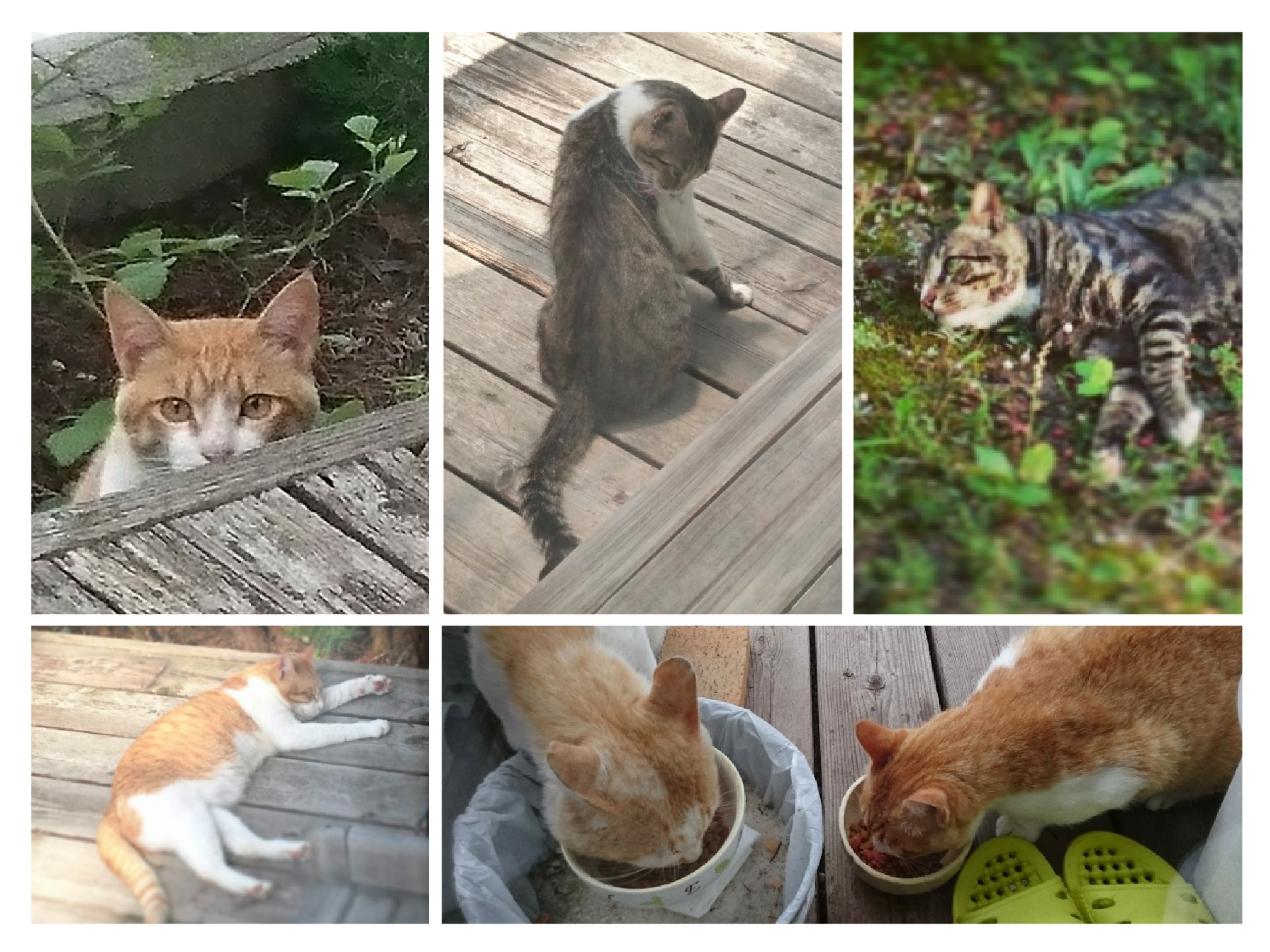 左上から時計回りに、ウッドデッキの下からちらりのハナコ、毛繕いに忙しいキジオ、草の上で黄昏るトラオ、仲良く食事中のボスとハナコ、眠りこけているハナコ。